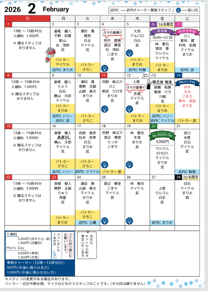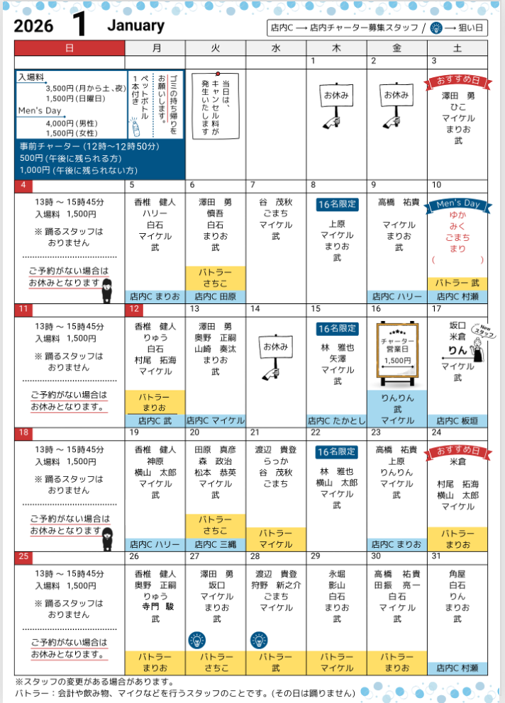 シフト表<全日・予約制>